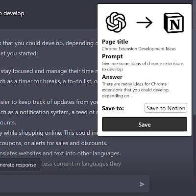 On ChatGPT's page, you'll notice a new pin icon under each of its answers. You can use it to save specifically that answer and the related prompt to your Notion database of choice. If you want to save the whole discussion, you can do so from the extension popup.