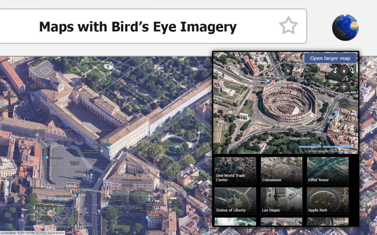 在扩展的弹出窗口上,你会发现热门景点的列表。当您单击此列表上的位置时,您将获得鸟瞰互动地图。鸟瞰图是从上面对物体的提升视图,其视角就像观看者是一只鸟。它看起来像一个城市的3D模型。您可以放大和缩小,旋转 90 度并四处移动。使用搜索框查找地球上的位置。单击"打开较大的地图"按钮时,地图将在外部网站上打开。我们创建了这个扩展,以规划您的下一个假期在流行的城市和地球上的地方。此 Chrome 扩展程序使用必应地图 API 和 Google 地图 API。
