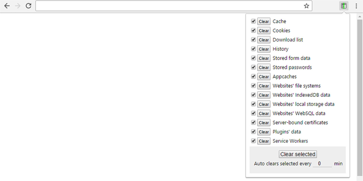 Chrome data cleaner 插件安装完成以后,无需刷新即可使用。直接在 Chrome 浏览器任意网页中点击浏览器上方工具栏中的插件图标,网页右上角将自动弹出一个小窗口,用户可根据需要对需要清理的数据进行勾选。勾选完毕,点击【 Clear selected 】即可一键进行清理。