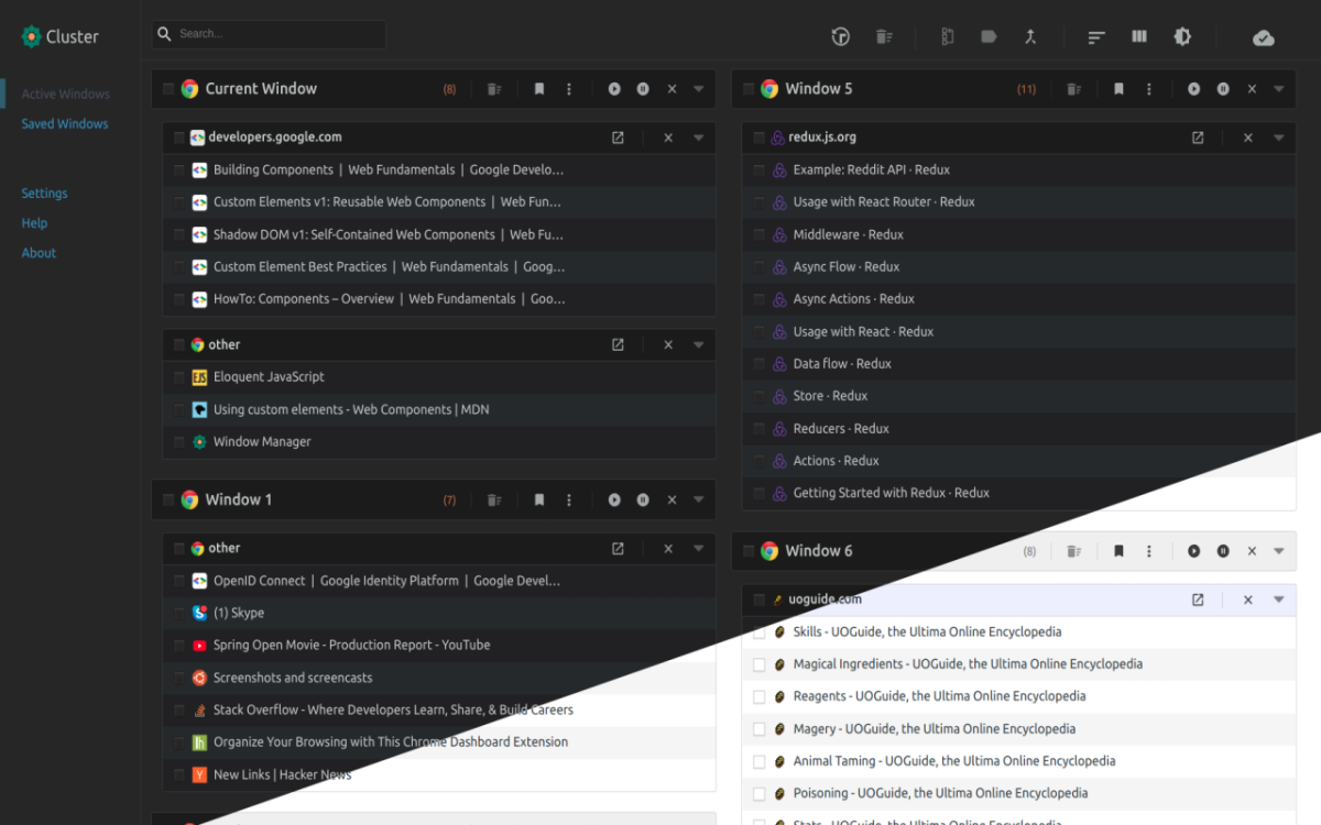 Cluster 插件是一款简单实用的窗口和选项卡管理器,该插件适用于 Chrome 浏览器,可用于帮助用户简单地管理多个打开的选项卡和窗口,以快速、安全的控制用户的浏览器会话,保持有序并释放内存。