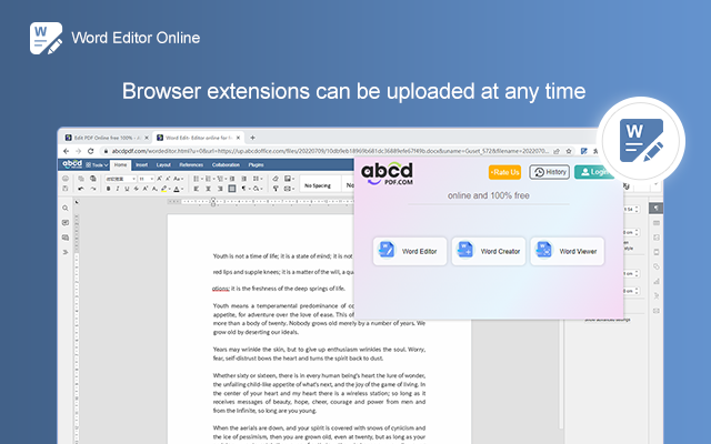 Word 在线编辑器插件是一款适用于 Chrome 浏览器的在线免费 Word 编辑器,该插件支持在线选择 Word 、 DOCX 文档进行上传并在线编辑,可轻松将图像、文本和评论添加到 Word 文件之中,100% 完全免费。
