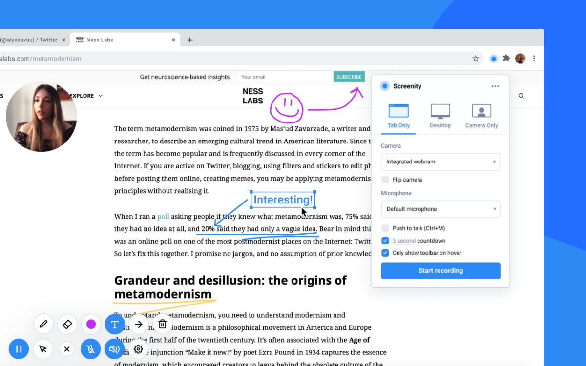 作为 Chrome 浏览器中的一款知名且免费的网页屏幕录制工具,screenity 插件支持对浏览器任意标签页、桌面、任何应用程序以及摄像头进行快速捕捉并录制视频,同时支持在屏幕任意位置进行绘画、添加文本和箭头等标注,最后可导出为 MP4 、 GIF 和 WebM 格式,也可保存视频到谷歌云盘。