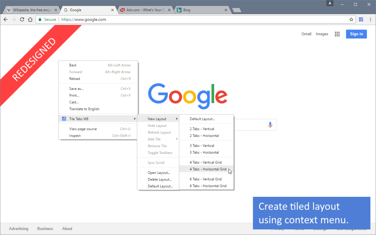 作为一款功能强大的网页分屏显示工具,Tile Tabs WE 插件支持在右键菜单中为用户提供多种布局,如下所示: