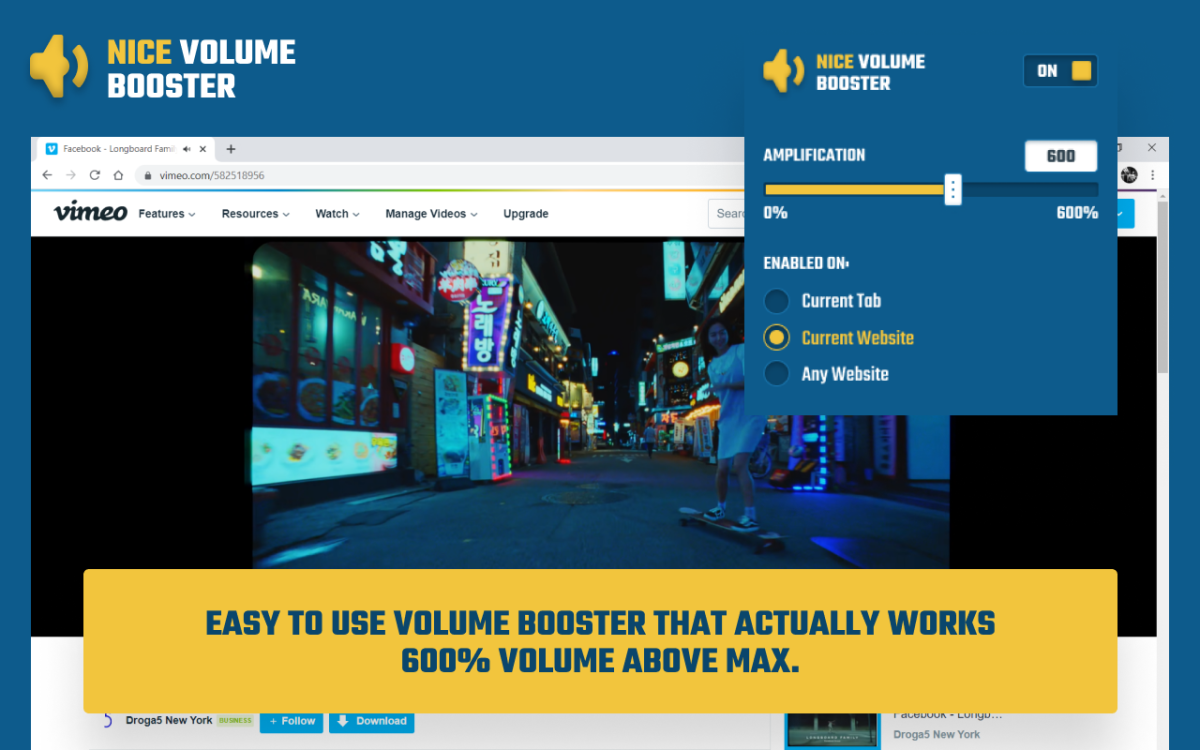除了当前网页的音量之外,Nice Volume Booster 插件可立即用于 Chrome 浏览器中的多个网站,用户可以窗口底部点击【 Current Website 】或【 Any Website 】,可增强当前整个网站或任何网站的音量效果,非常易于使用,且不会减缓各种网页的装载速度和运行。
