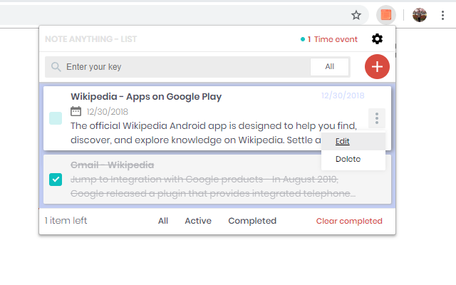 Note Anythings 插件安装完成以后,直接在 Chrome 浏览器任意网页点击浏览器上方工具栏中的插件图标,网页右上角将自动弹出一个简约、干净的小窗口,点击左侧的红色【 + 】即可添加便签笔记,用户可以在【 Title 】中添加笔记标题,并支持选择具体时间,在【 Content 】中可添加具体笔记内容。