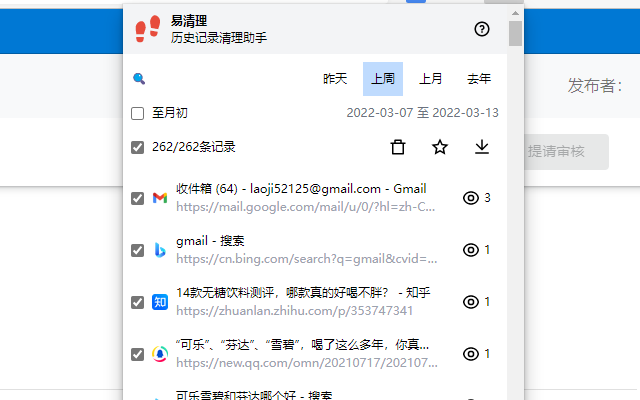 易清理插件安装完成以后,直接在 Chrome 浏览器任意网页点击浏览器上方工具栏中的插件图标,网页右上角将自动弹出一个小窗口,里面会以列表形式显示昨天、上周、上月、去年的本地历史记录,如果是刚安装使用,去年、上周和上月的历史记录将显示为空白。