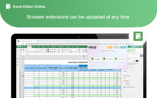 作为一款免费好用的 Excel 文档编辑与阅读工具,Excel 在线编辑器插件基于 Abcdpdf.com 在线版进行 Excel 免费协作,无需安装任何软件便可以让用户在 Chrome 浏览器任意网页中能够在线创建或编辑 Excel 文档,也可以将文档保存为 Excel 文档、 PDF 或其他常用文件。