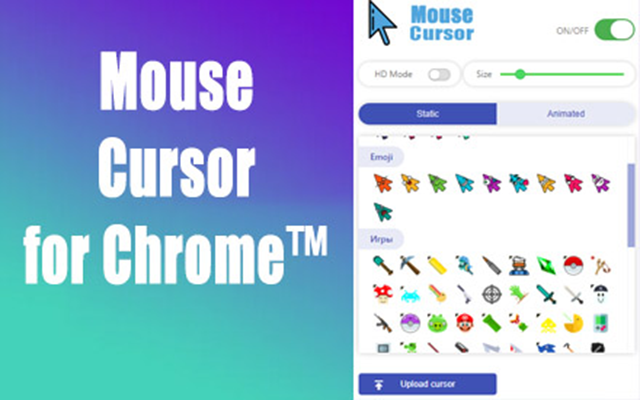 作为一款网页鼠标自定义工具,Mouse Cursor for Chrome™插件为用户提供了各种口味的游标以及动画游标,让用户可根据需要或者喜好进行使用。若不喜欢内置的光标图案,用户还可添加了更多类别的自己喜欢的自定义光标图案,直接上传即可点击 使用。
