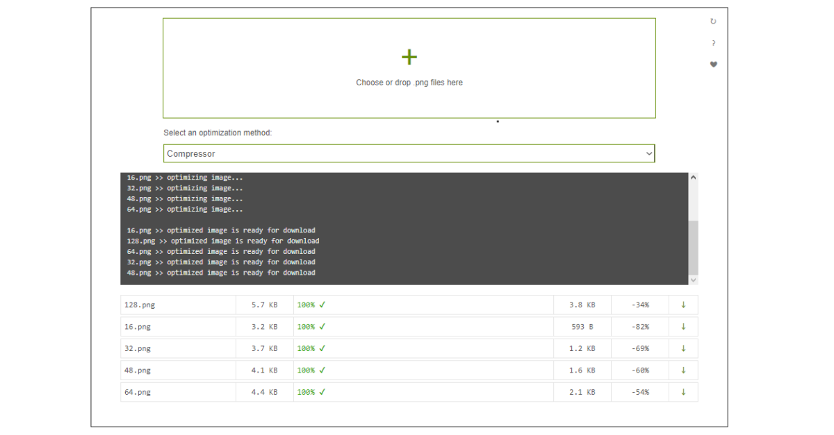 图片上传完毕后,PNG Optimizer 插件将自动对 PNG 图像进行优化,可轻松减少文件体积。优化完毕,直接点击文件列表右侧的绿色下载图标即可快速保存。有了这款实用工具,用户再也不用惧怕一些平台的上传限制了,也无需安装额外的图片处理软件压缩图片。