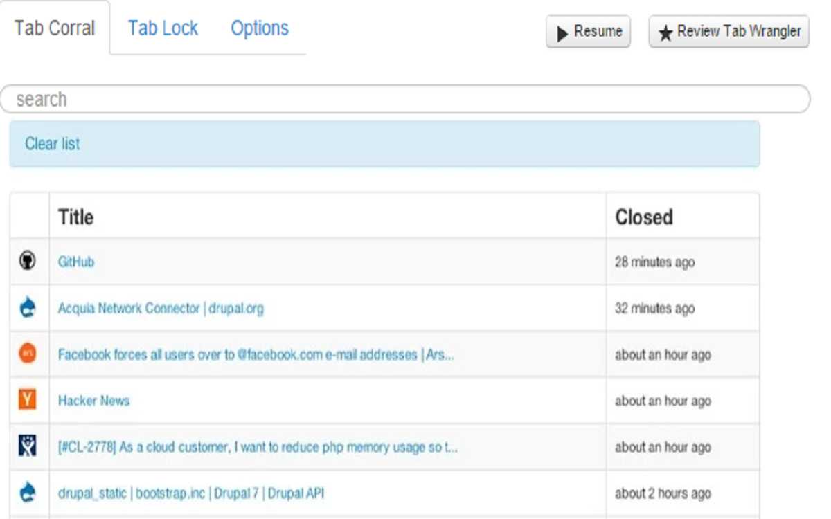 所有列表将以关闭时间进行分组,用户可以直接点击分组上方的【 restore all 】一键快速还原关闭的标签页。与此同时,用户还可点击窗口顶部的【 pause 】暂停自动关闭并保存标签页的功能,对于时间设置,用户可点击【 options 】进入设置页面根据需要更改。