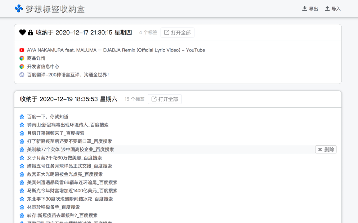 想要查看已经收纳的标签页,直接点击相应的标签标题即可快速访问,或者也可点击页面顶部的【打开全部】一键还原所有收纳的标签页。与此同时,用户还可以对需要的标签页进行置顶、收藏、改名或者删除。需要注意的是,通过梦想标签收纳盒插件删除的标签页无法在 Chrome 历史记录中找回。