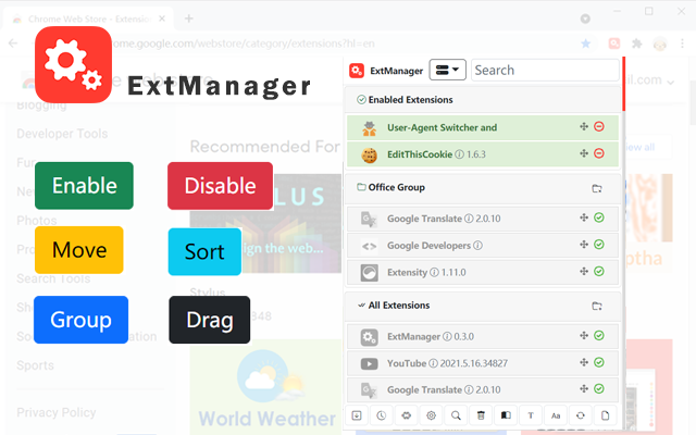 ExtManage 插件是一款用于管理 chrome 扩展的工具,支持一键快速启用 / 禁用已安装扩展程序,并且支持为扩展分组、自定义排序,比 Chrome 浏览器自带的扩展程序管理功能使用更加方便快捷。