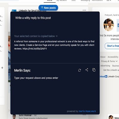 Merlin has a revolutionary new UI for using OpenAI's ChatGPT on all your favourite sites. For example Google Search, Gmail, LinkedIn, Github and everywhere else you search or write online.
