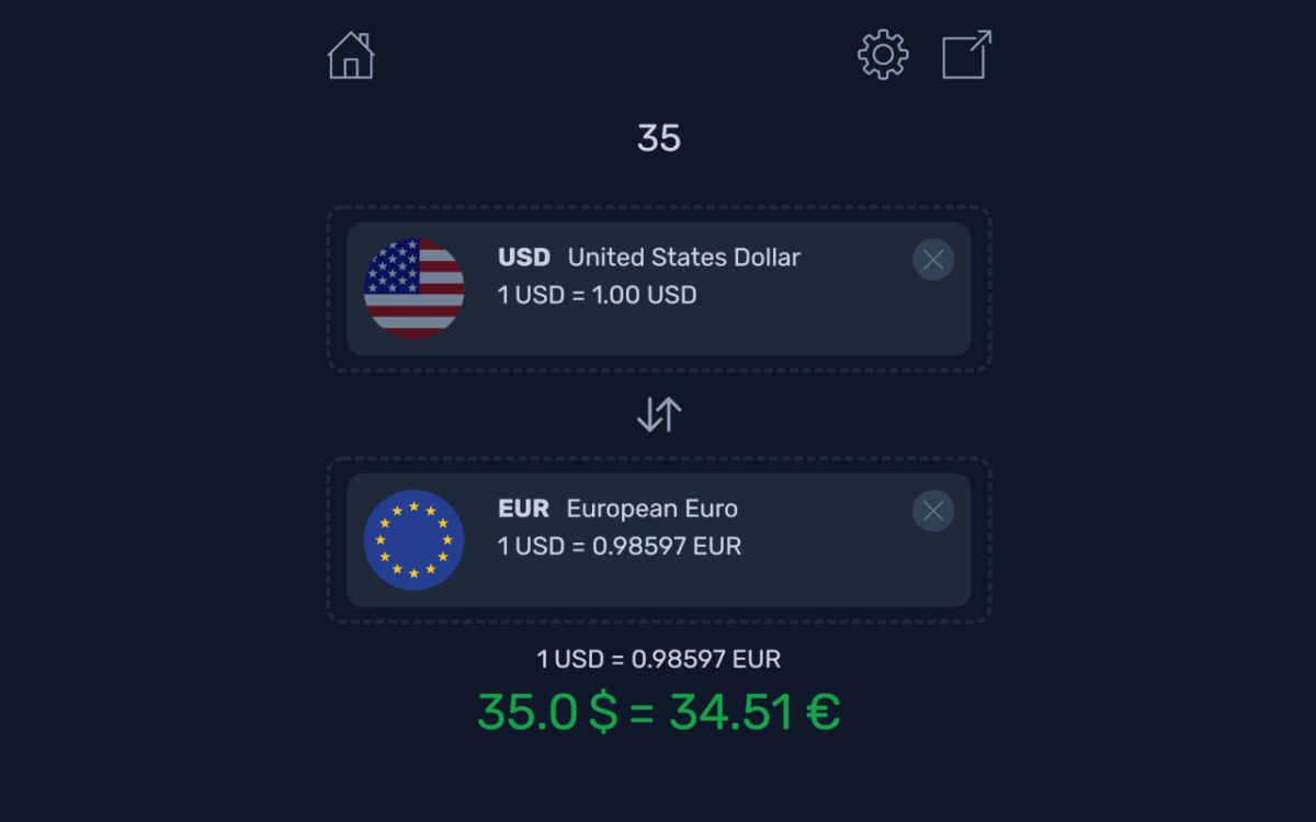 If you are using a dark theme for your system or browser Currency Converter NEO comes as well with a beautiful dark theme, refined and adapted to low light environments.