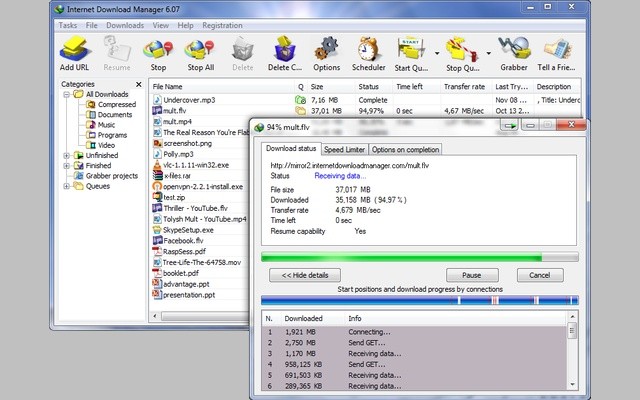 2.多媒体下载:只要打开想要下载的音视频网站页面,IDM 就会自动检测在线播放器发出的多媒体请求,并在播放器上显示下载浮动条。用户可以直接下载流媒体网站中的视频,在本地离线观看。