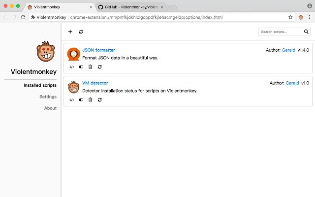 Violentmonkey provides userscripts support for browsers. It works on browsers with WebExtensions support. It supports most scripts for Greasemonkey and Tampermonkey.