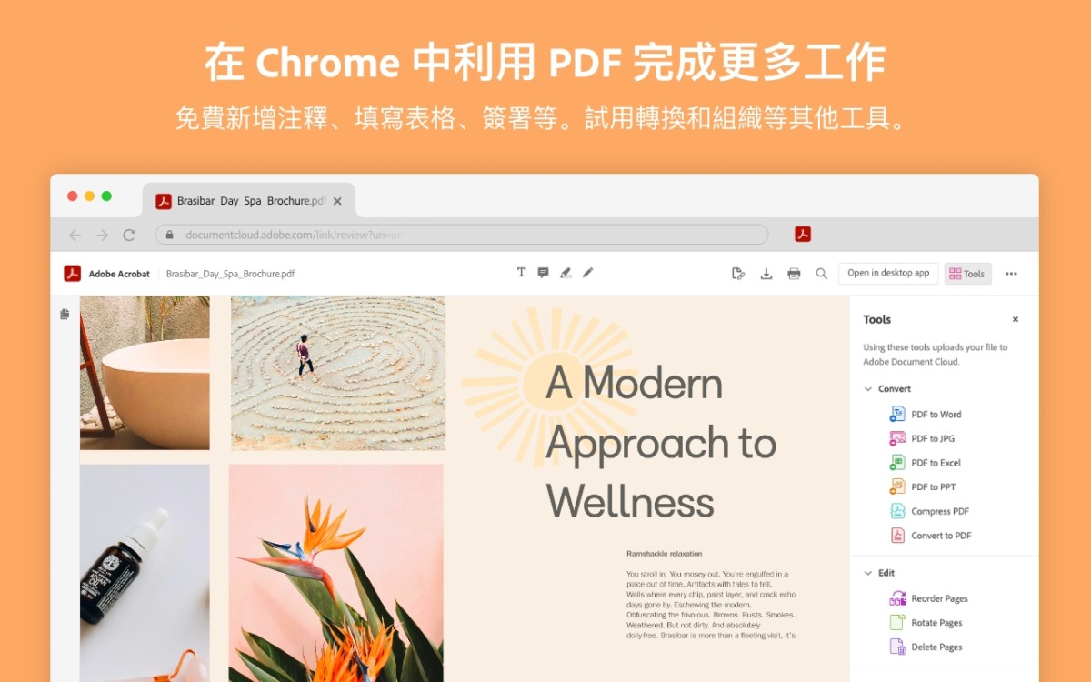 利用 Adobe Acrobat PDF 工具在 Google Chrome 中完成更多任务:查看、填充、注释、签名,您还可以试试转换和压缩工具。
