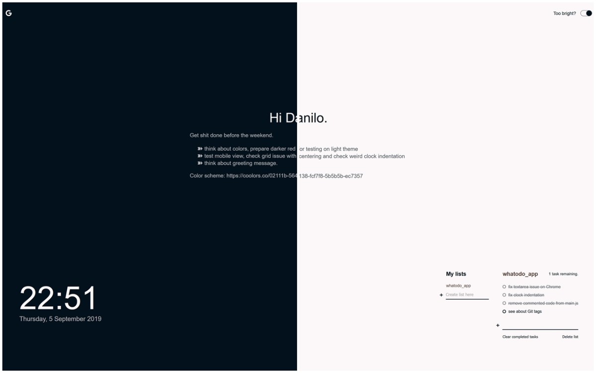 与此同时,用户还可以点击页面右下角的【 My lists 】添加重要的待办事项以及进行备注,让用户可以轻松提升生产力,提高工作效率。此外,除了明亮模式之外,Whatodo Tabs 插件还支持暗黑模式,直接点击右上角的【 Too dark 】即可一键快速切换。