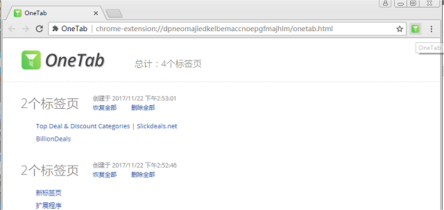 OneTab 插件安装完成以后,无需刷新网页即可使用。直接在 Chrome 浏览器任意网页点击浏览器上方工具栏中的插件图标,浏览器中所有打开的标签页将自动转换成一个列表并在 OneTab 中显示,只需一键,即可轻松实现。