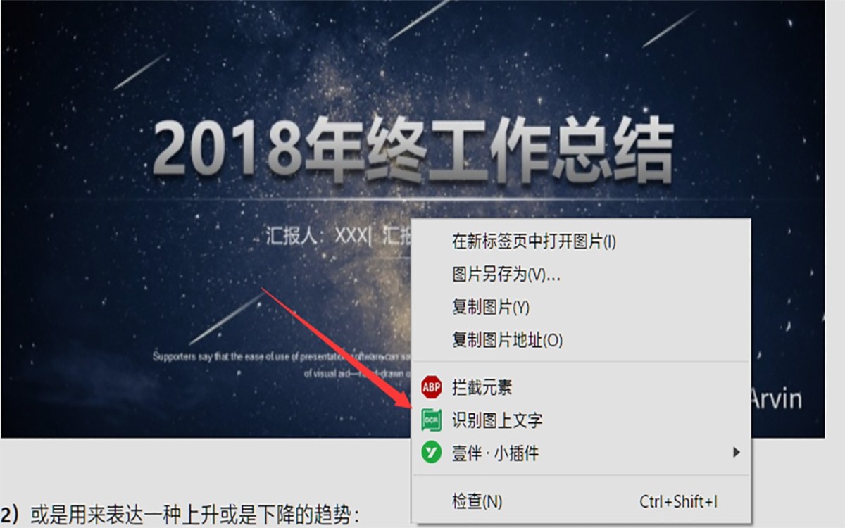 3、安装完成后,在图片上右击鼠标会出现下图,点击识别图上文字即可将文字识别下来。