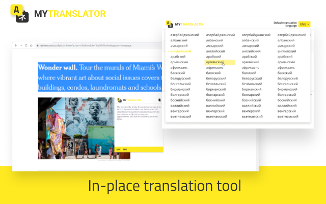 My Translator is a translator tool from one language to another. You don’t have to leave the page to get a translation - we show the translation tool INLINE.