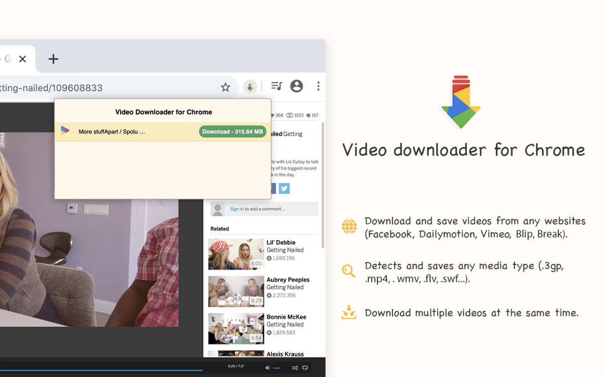This extension allows you to download video files from almost any page for further viewing on your computer. It supports a huge selection of sites including Facebook, Dailymotion, Vimeo, Blip, Metacafe, Break as well as thousands of others.
