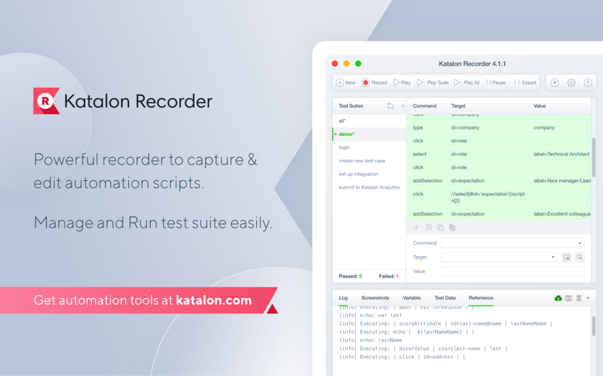Katalon Recorder is the most UI-friendly and simplest extension for Record and Playback on Chrome, Firefox, and Edge. A perfect Selenium IDE alternative as your daily drive web recorder.