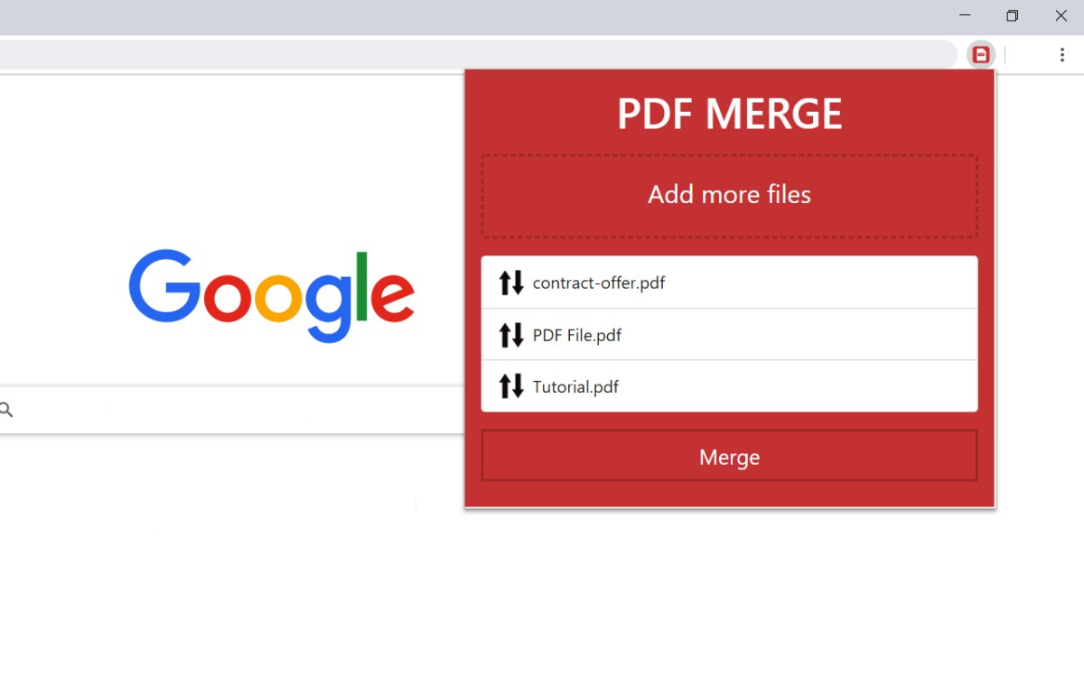 点击浏览器上的插件图标,在右上角会弹出一个小的菜单窗口,点击【Select Files】,选择需要合并的PDF文档。文件上传完毕后,单击【Merge】,等待PDF文档合并。合并完成后,会自动下载到电脑上。