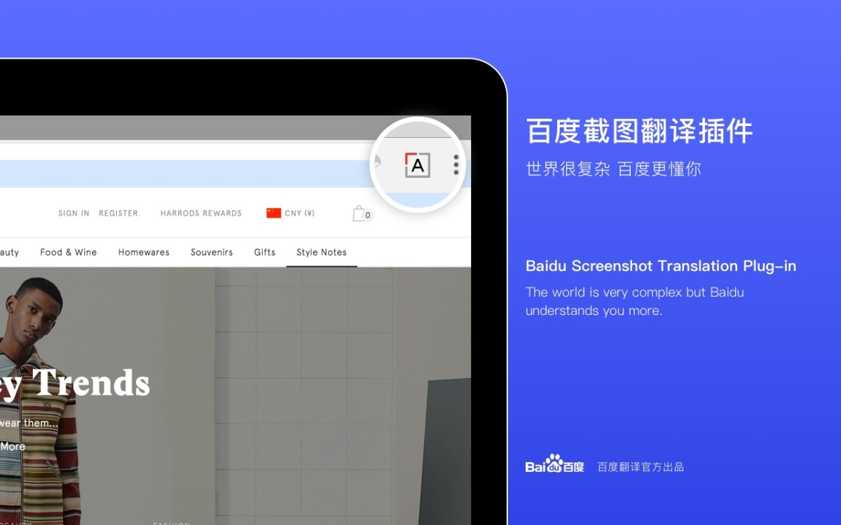 Officially produced by Baidu Translate, supporting translation between Chinese and English. In any interface of the browser, having a screenshot with mouse, you will get the translation of the characters in the picture with the corresponding original text.