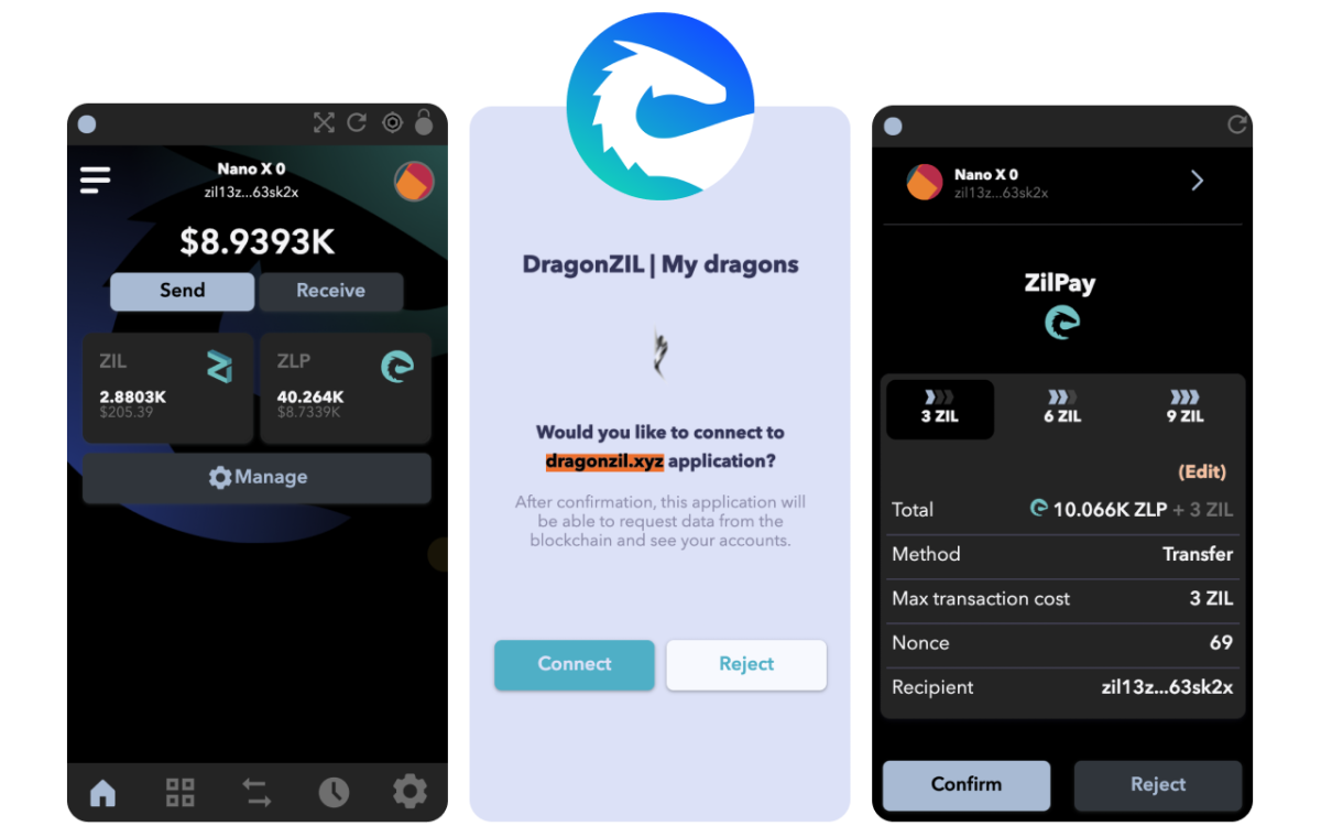 ZilPay also lets the user create and manage their own identities (via private keys, local client wallet and hardware wallets like Ledger), so when a Dapp wants to perform a transaction and write to the blockchain, the user gets a secure interface to review the transaction, before approving or rejecting it.