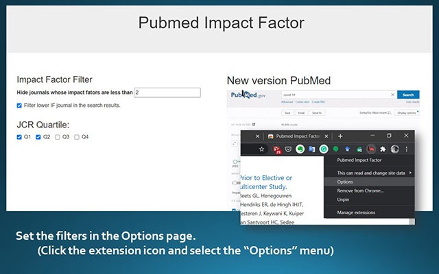 - 在PubMed网页上显示期刊的影响因子(IF);隐藏IF较低的日记帐的结果(请参阅选项)。