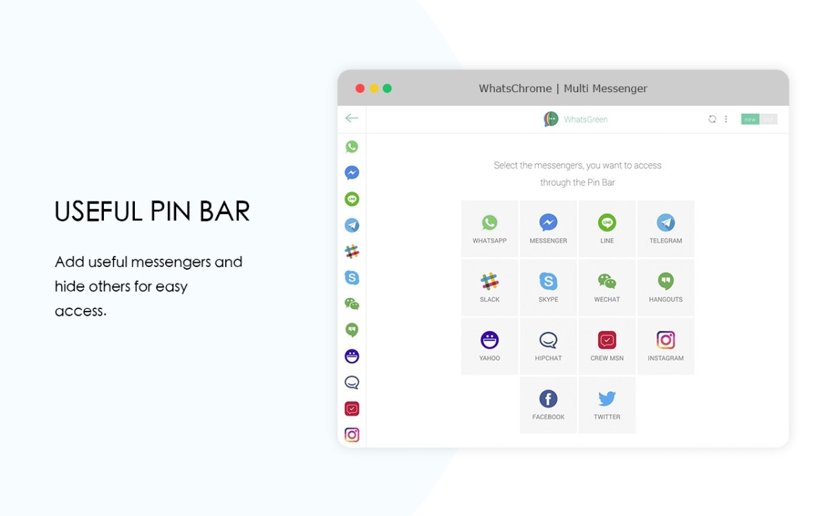 Meet WhatsGreen - an ultimative Multi Messenger, which supports all the mainstream worldwide chats and messengers. Leave jumping from chat to chat and switching between WhatsApp and FB Messenger in the past - one app brings all the communication power to your browser and it's called WhatsGreen.