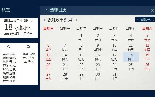 墨菲日历插件具有直观性、准确性、简洁性的特质。直观性,快速查看日期,清楚明了;准确性,所有日期、节日、假日,标注正确无误;简洁性,界面朴素明快,无多余的文字图片干扰。