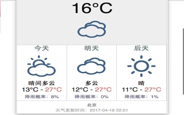 "三天"可显示您的地理位置,会自动显示您所在地三天内的的天气状况(温度、降雨概率)